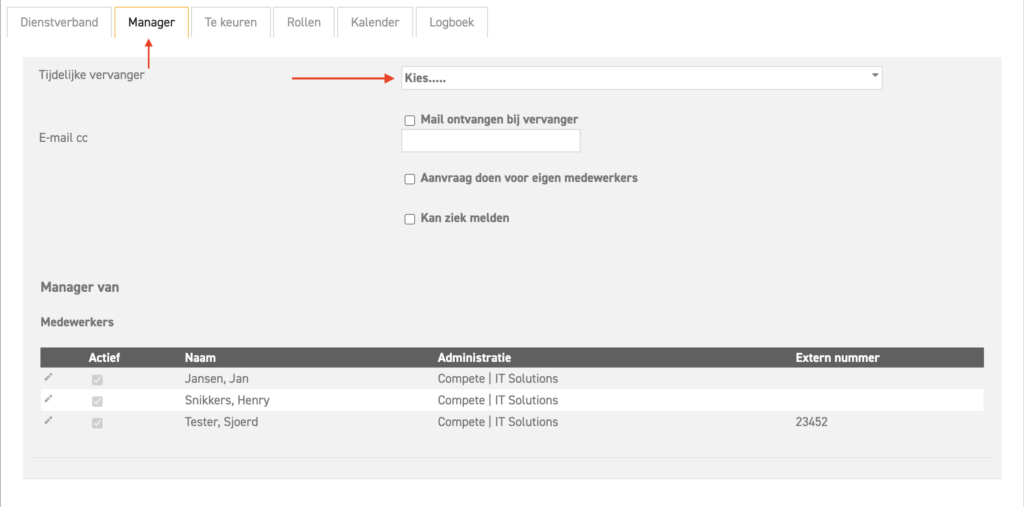 Wanneer je de optie ‘Mail ontvangen bij vervanger’ aanvinkt, zal de originele manager nog wel e-mails ontvangen van aanvragen e.d. Op deze manier kan de afwezige manager nog wel meelezen met zijn vervanger.