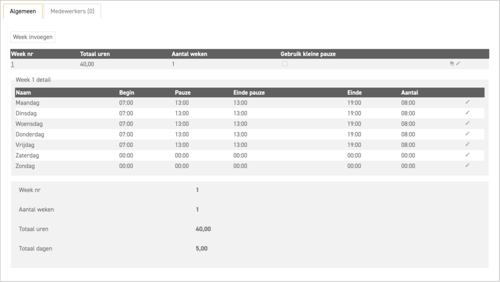 Het is belangrijk dat het aantal uren in een dag overeenkomen met het aantal uur dat de medewerker per dag dient te werken.