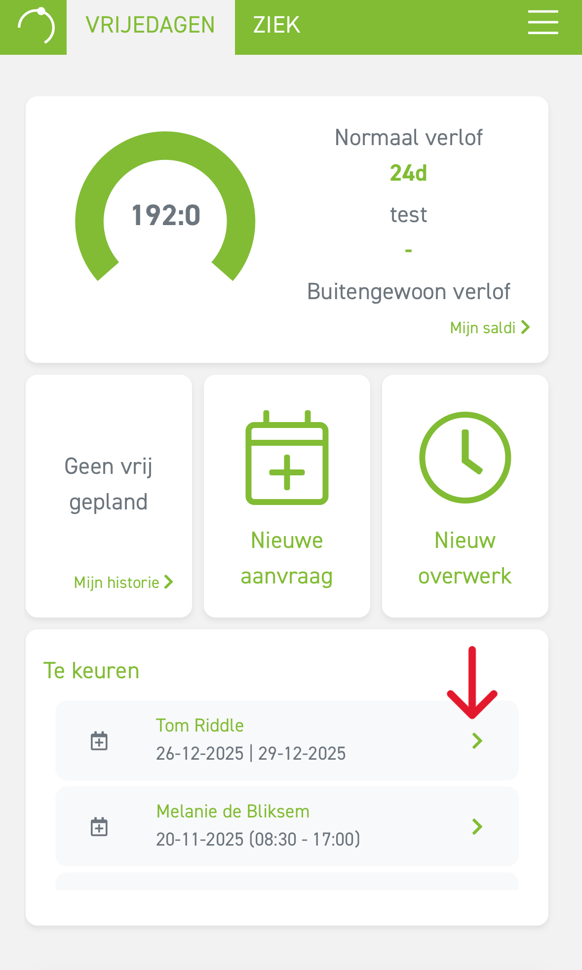 Om deze te keuren, klik op het pijltje aan de rechterkant van de aanvraag in het ‘Te keuren’ scherm