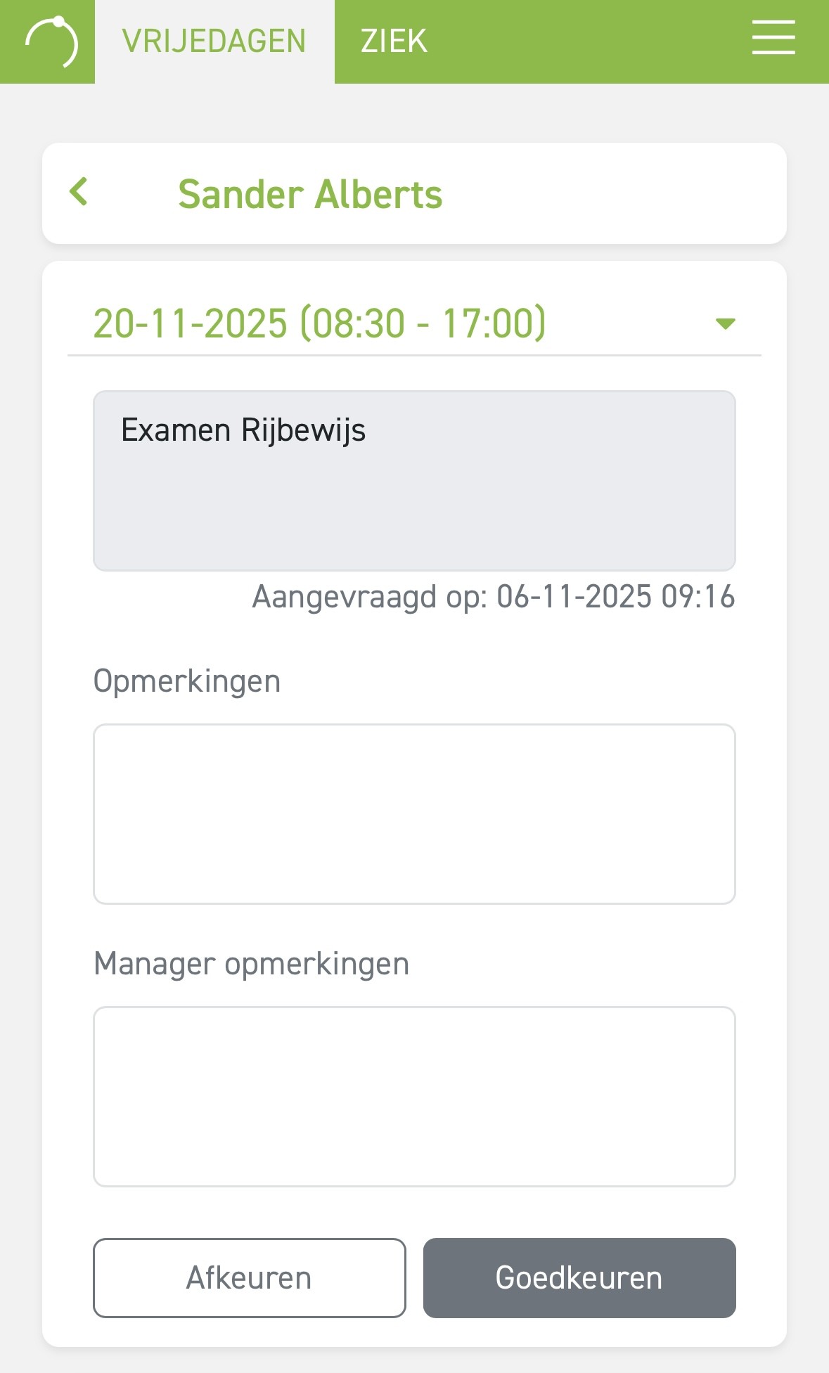 Het onderstaande scherm wordt weergegeven. In de bovenste tekst balk kun je zien welke reden de medewerker heeft meegegeven voor de aanvraag.