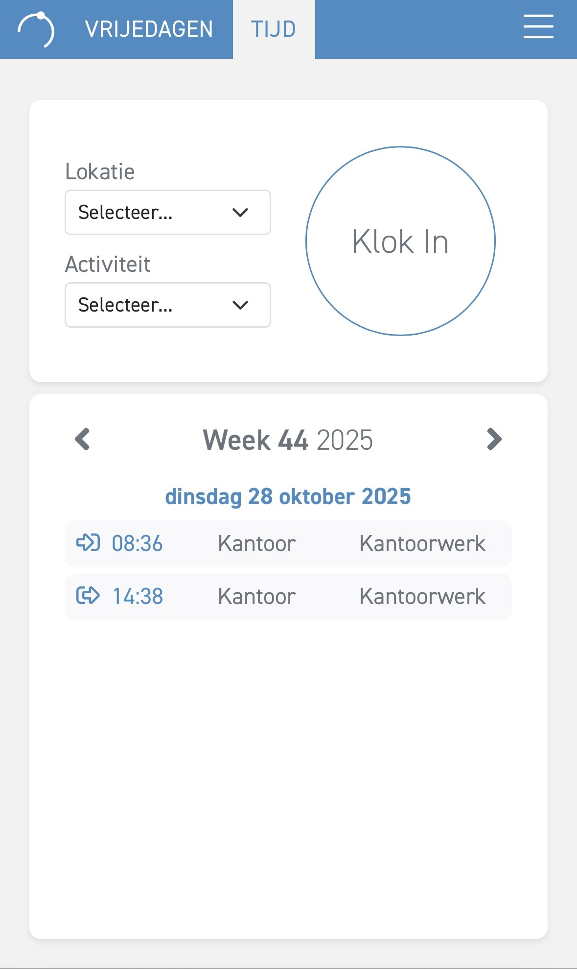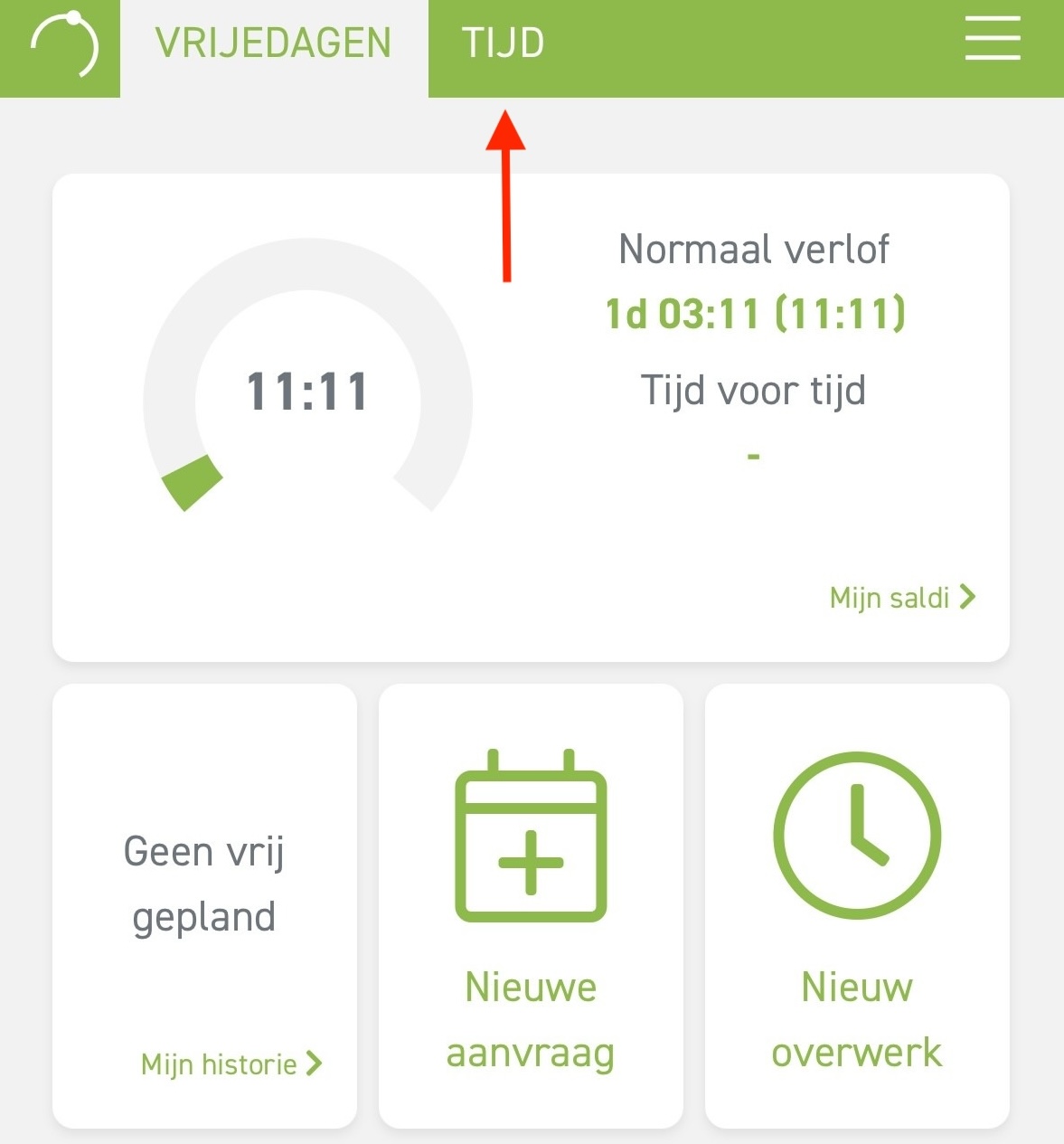 Bovenin het scherm zie je “VrijeDagen” en “Tijd” staan, klik op ‘Tijd’ om naar de pagina voor Tijdsregistratie te gaan.