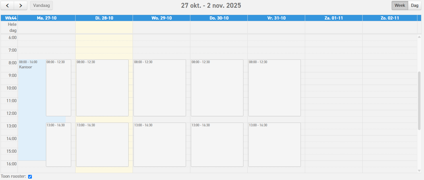Onder de kalender is een selectie vakje “toon rooster”. Hiermee geef je aan of in de kalender de tijden van het rooster zichtbaar moeten zijn.
