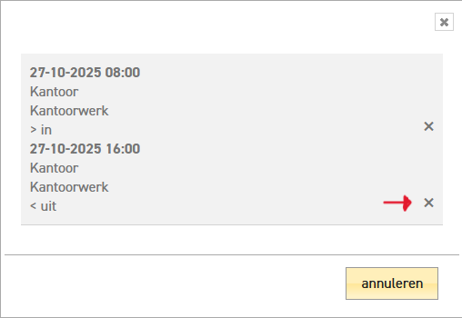 Om de geregistreerde tijd te verwijderen klik je op de geregistreerde tijd. Achter het klokmoment staat een kruis waar je op kunt drukken. Zodra je het zeker weet, druk je op opslaan. Dit zal het klokmoment verwijderen.