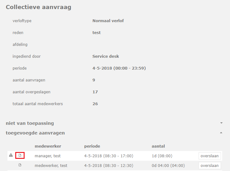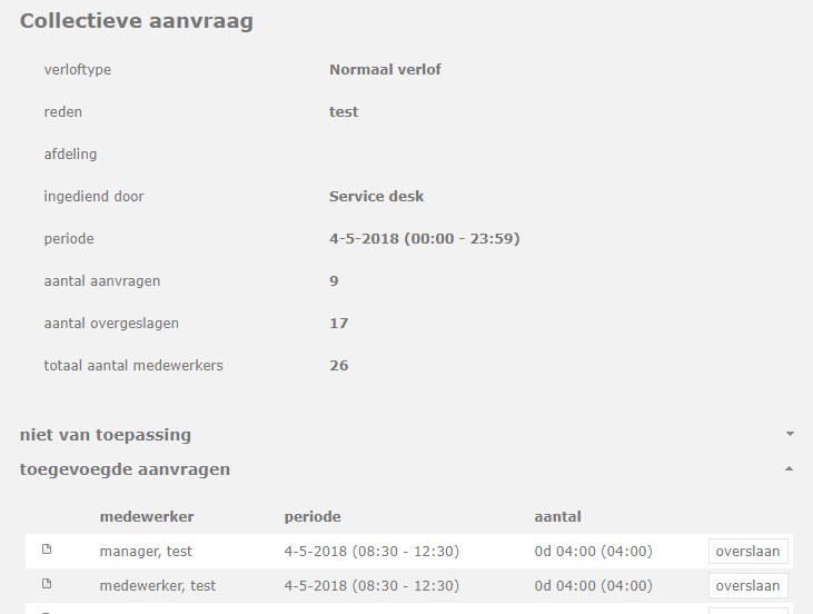Als je op de aanvraag zelf klikt zie je voor wie allemaal. Het systeem geeft ook aan hoeveel aanvragen zijn overgeslagen. Dat kan zijn omdat medewerkers bijvoorbeeld al een aanvraag op deze dag hadden staan.