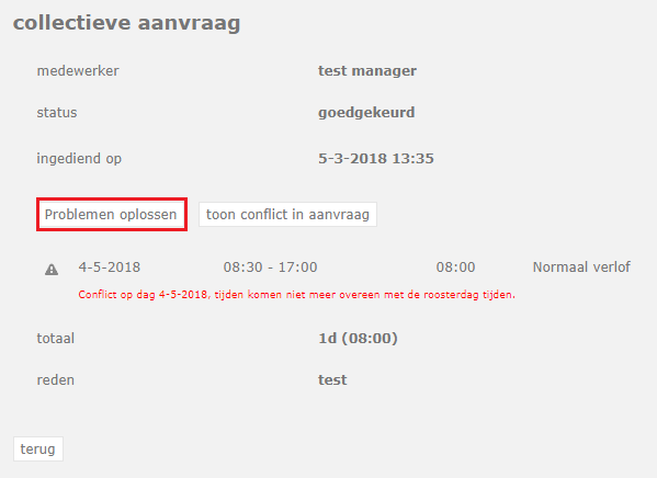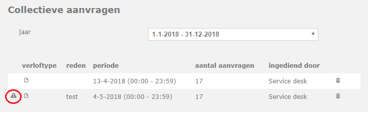 Als je als beheerder dit uitroepteken voor een collectieve aanvraag ziet staan, betekend dat er op deze aanvraag volgens de analyzer een conflict van toepassing is.