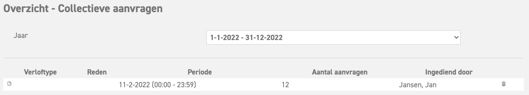 Om te controleren voor wie deze dagen allemaal zijn uitgevoerd kun je in het menu naar 'Vrijedagen (module bovenin)' ⇒ 'Overzicht' ⇒ 'Collectieve aanvragen' gaan. Hierin zie je nu alle collectieve aanvragen staan.