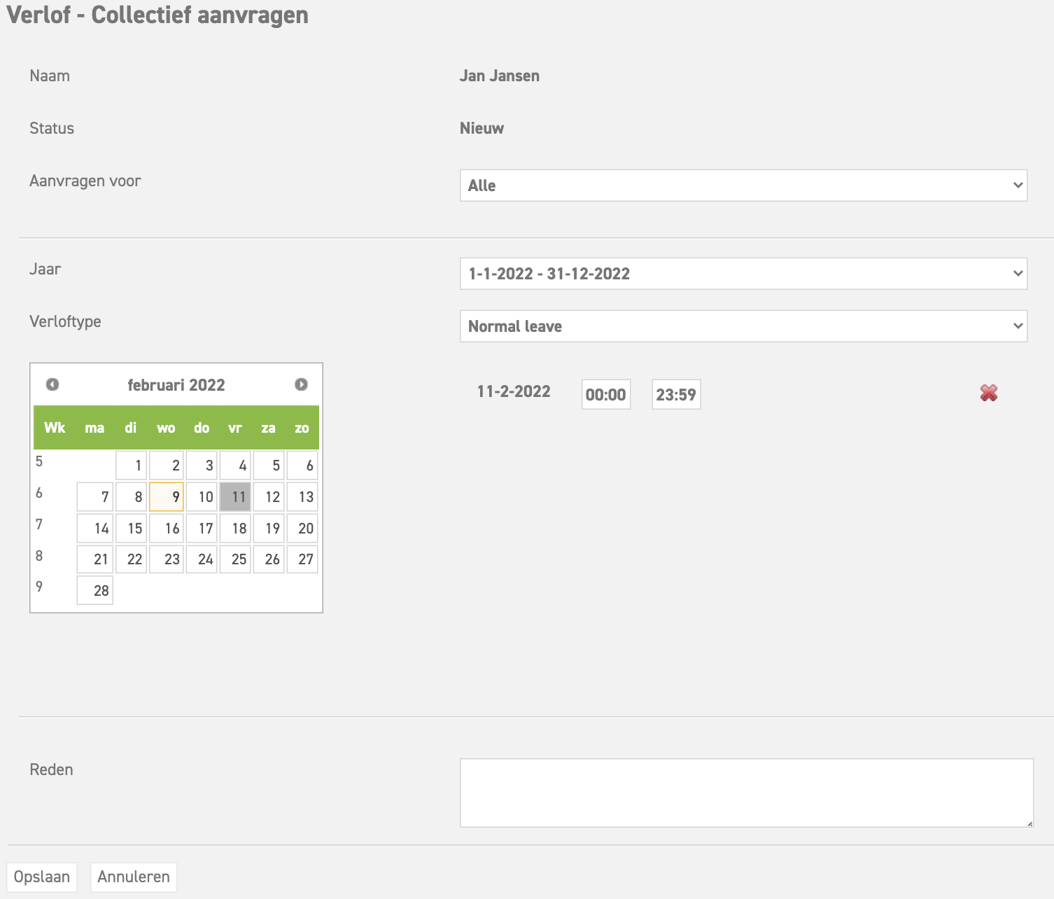 Ga naar 'Vrijedagen (module bovenin)' ⇒ 'Verlof' ⇒ 'Collectief aanvragen' in het menu links. Er kan nu gekozen worden om voor iedereen een collectieve vrije dag in te boeken of voor een bepaalde afdeling. Selecteer het verloftype waarvan saldo moet worden afgehaald voor deze vrije dag. Selecteer de dag in de kalender die vrij moet zijn. Zet in het opmerkingen vak de reden dat iedereen vrij is.