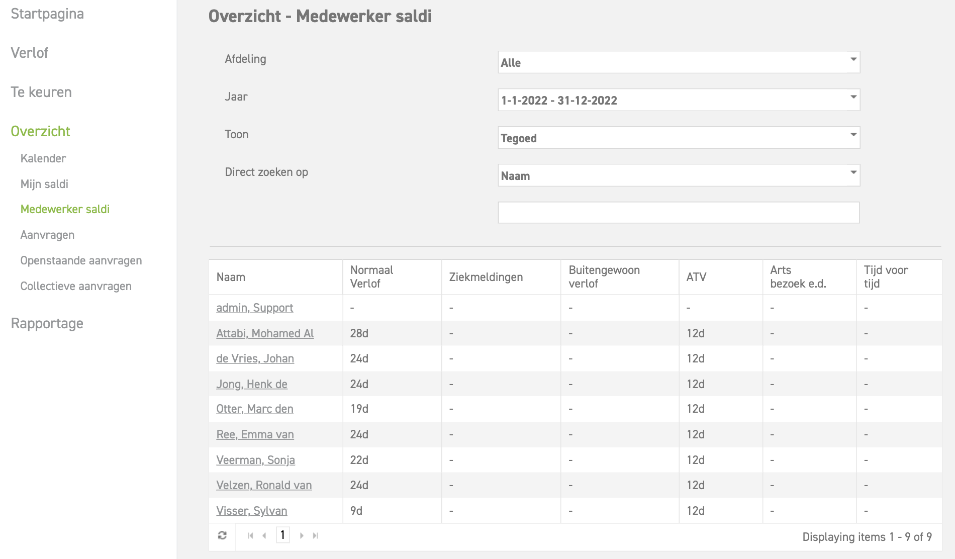 Zowel een medewerker als een manager en beheerder kunnen de berekening inzien van het saldo van het verlof. Hierin is te zien hoe het saldo is opgebouwd en wat er eventueel bijkomt door seniorendagen of ancienniteitsdagen.