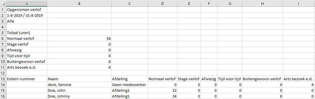 In dit rapportage wordt vanaf regel 5 een totaal overzicht getoond waarin zichtbaar is hoeveel uren per verloftype zijn opgenomen in de gekozen periode. Daaronder wordt dit per medewerker getoond.
