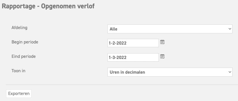 - Afdeling: Hier kun je de afdeling selecteren waarvan je het opgenomen verlof wilt bekijken