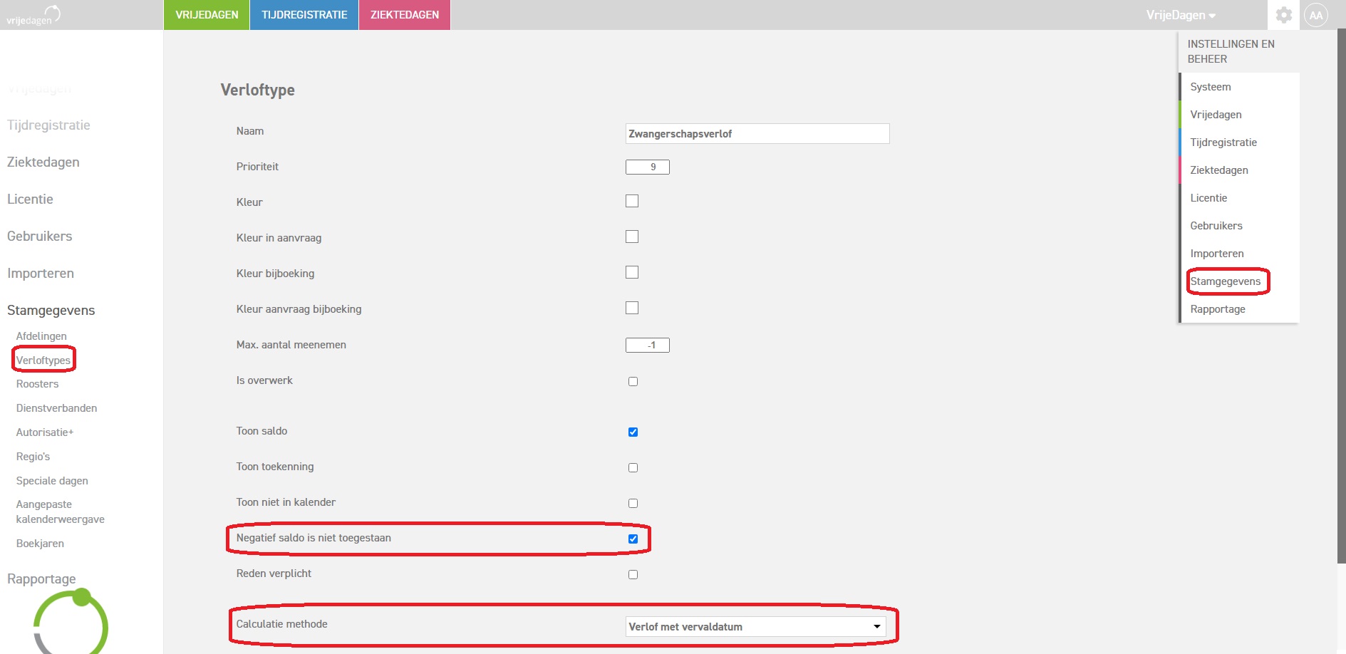 Wanneer een nieuw verloftype ingevoerd wordt, of een bestaand aangepast wordt, is hier de nieuwe "Calculatie methode" te vinden; "Verlof met vervaldatum". Het is dus alleen mogelijk verlofsaldi automatisch te laten vervallen op een specifiek verloftype wat hiervoor ingericht is. Let hierbij ook op dat "Negatief saldo is niet toegestaan" ook aan staat.