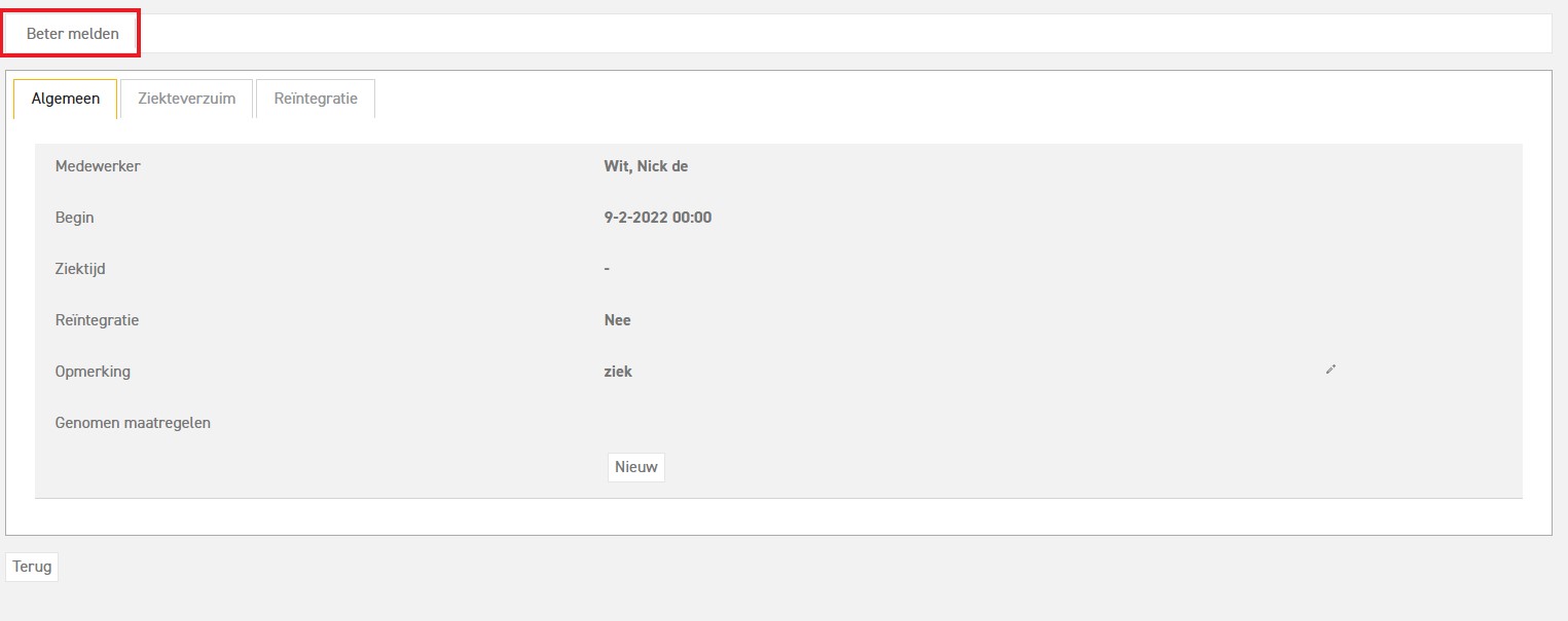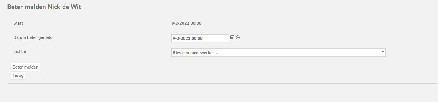 Scenario 1: Medewerker is beter vanaf begin van de werkdag. In dat geval hoef je alleen maar de datum van terugkeer in te vullen in het veld "Datum beter gemeld":