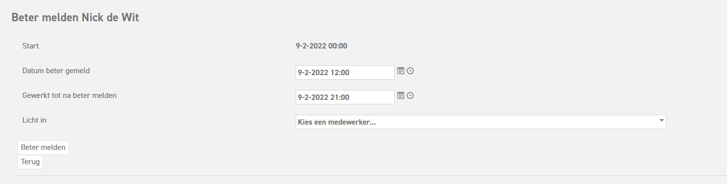 Bij "Datum beter gemeld" vul je in hoe laat de medewerker gestart is met werken.
